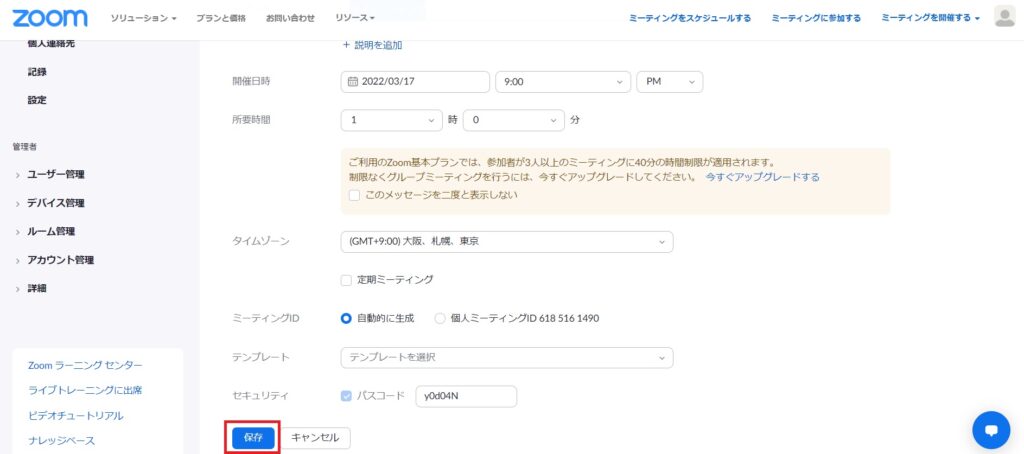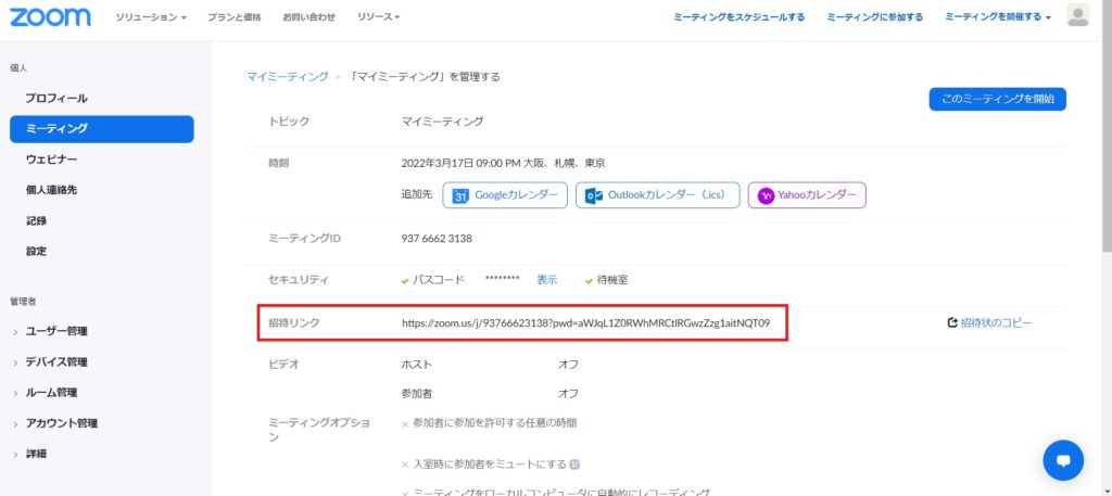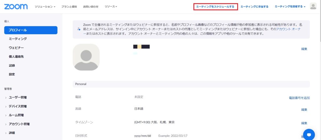 自分が主催の場合は「ミーティングをスケジュールする」を押下します。