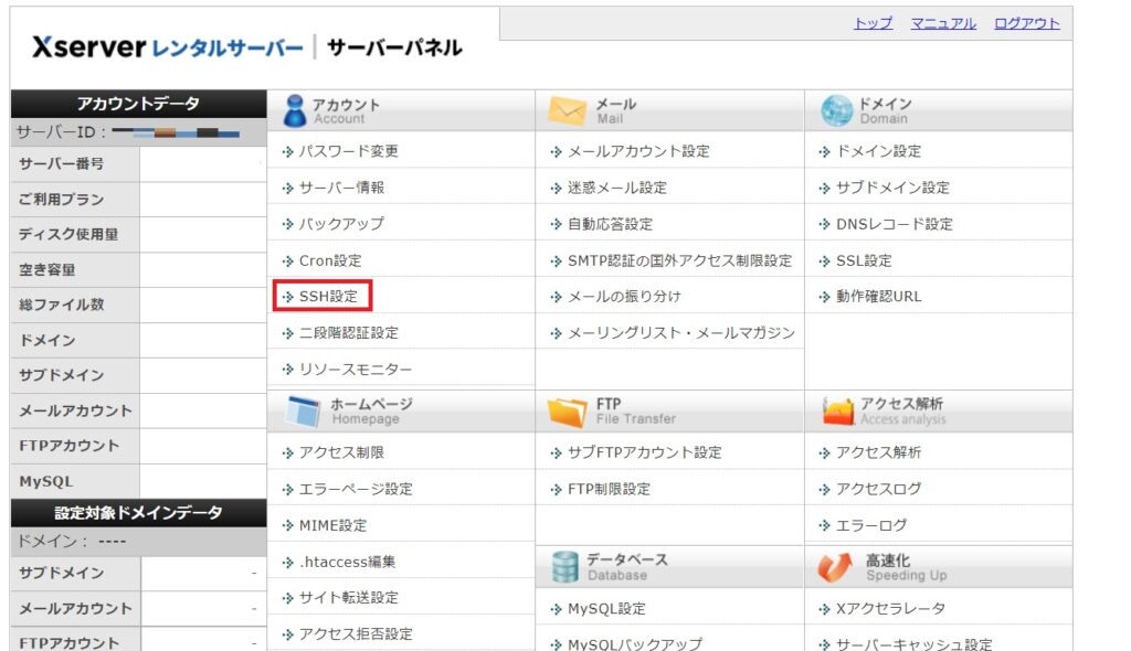 まずはエックスサーバーにログインしてSSHでのアクセスが出来る設定を行います。