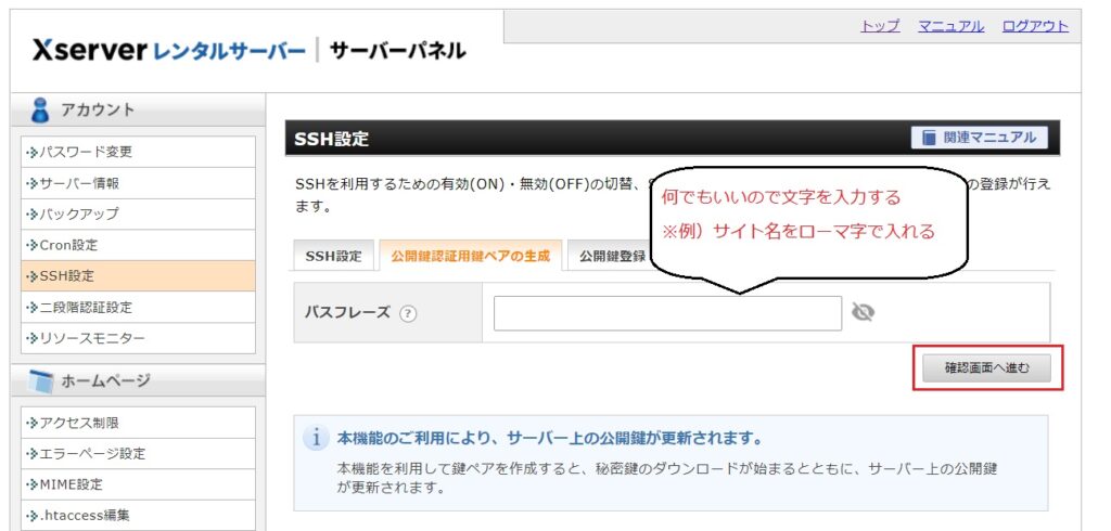 ※エックスサーバー側の鍵穴に鍵を差し込んでドアを開ける(通信する)と思って頂ければ・・・スペアキーを作成するという感覚でオッケーです