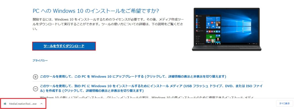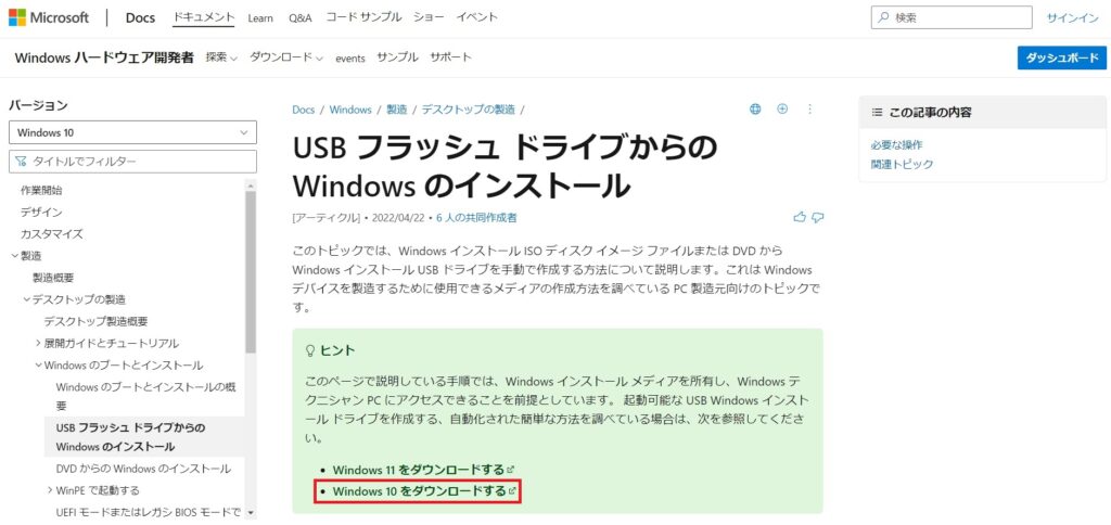 MicrosoftのページからISOファイルをダウンロードします。