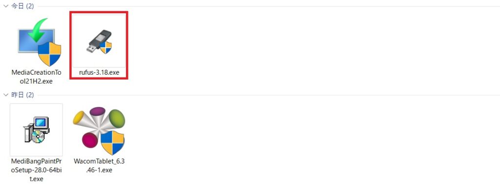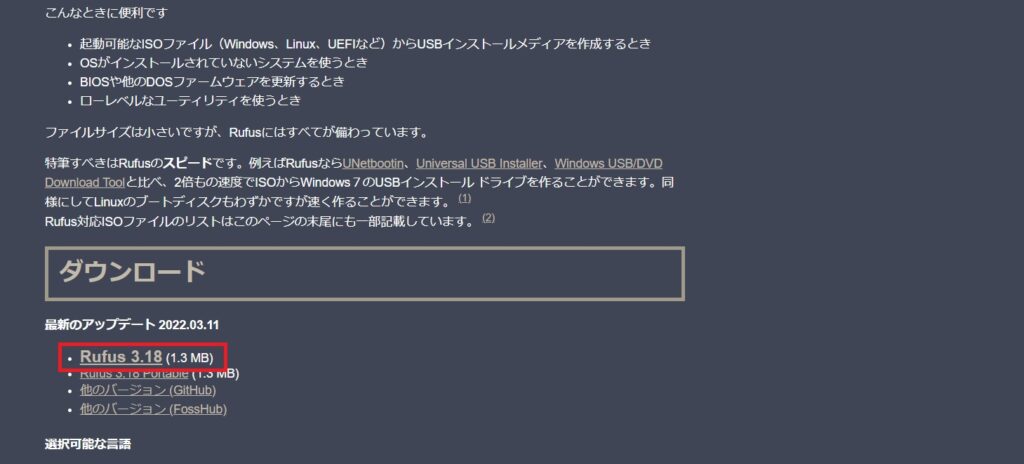 Rufusのホームページからツールをダウンロードします。