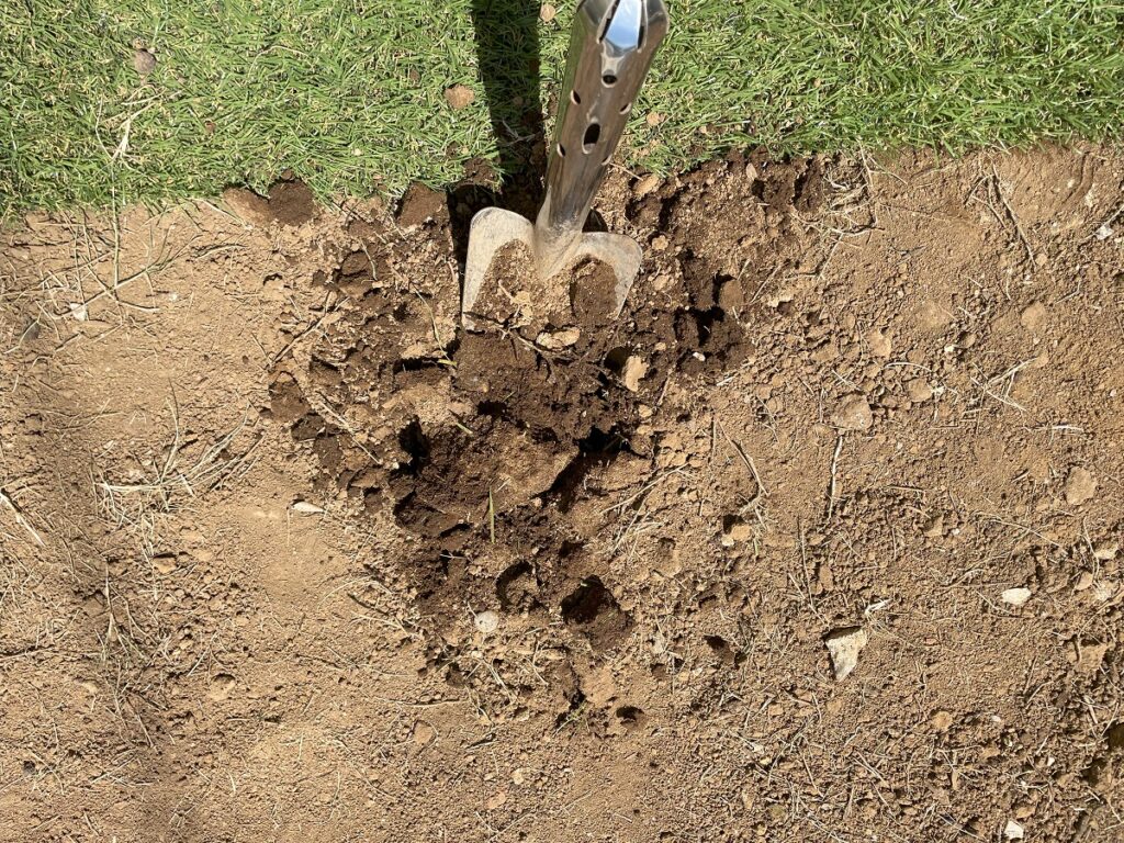 通常の大きいスコップでタケノコを掘るように、足で土に押し込みます。