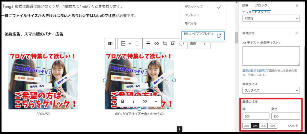 さて、最近300×250の画像(PCの追従バナー、スマホ版の広告バナー等)を張り付ける機会が増えました。