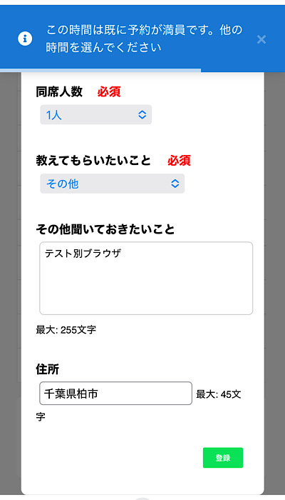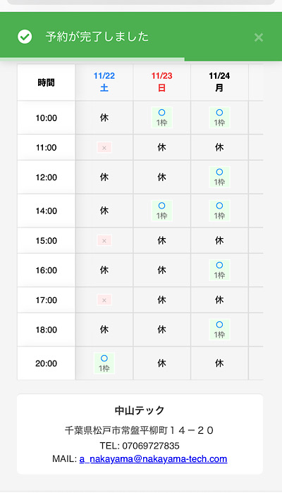 完了したら画面のように営業開始時間から予約間隔ごと、最終受付時間までの予約が可能です。
