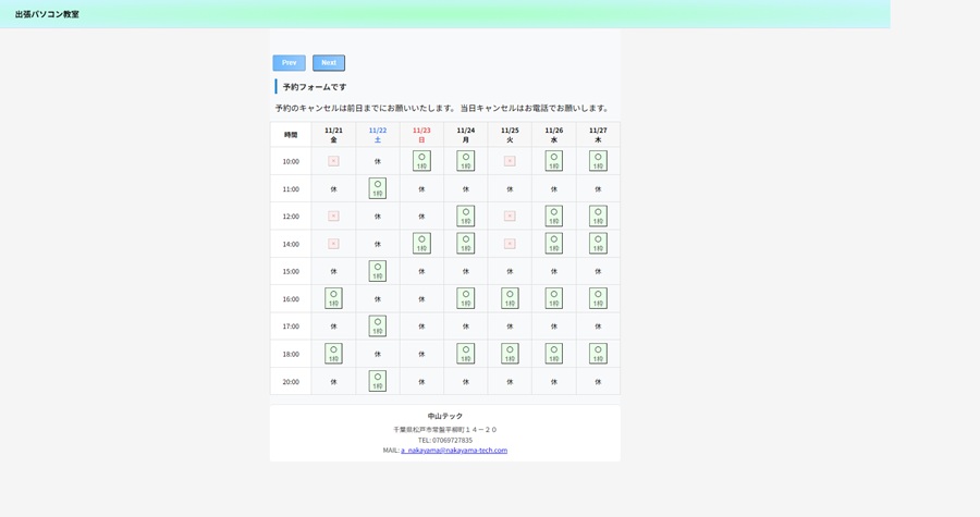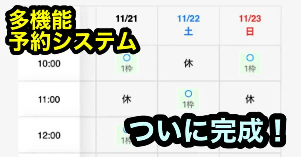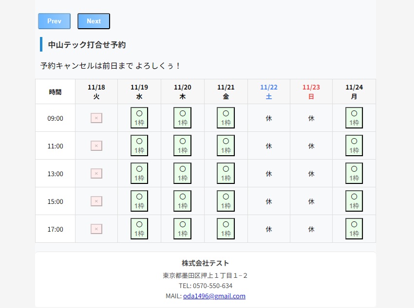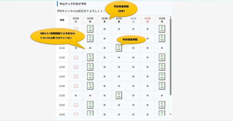 上記画像では月~金の9:00~18:00(最終受付時刻)を1時間おきに予約可能となっています。