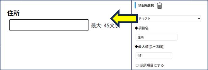 管理画面では「テキスト」を選択し、項目名を入力します(上記画像なら住所)。
